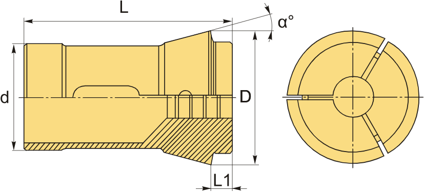Для зажима круглого прутка Ø 21 мм. D цанги 60 мм, L 94 мм, хвостовик d 48 мм, a 16°. Цанга главного шпинделя для автоматов продольного точения.